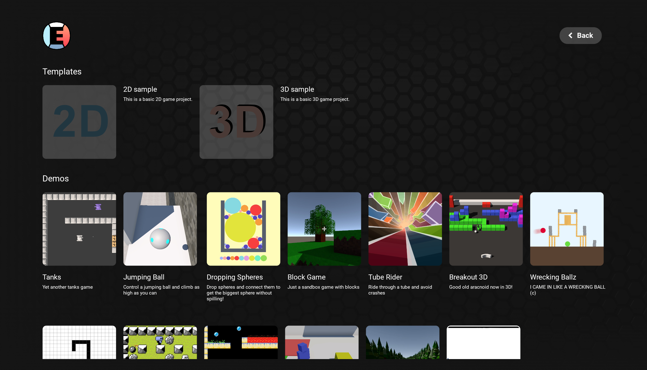 EdenSpark starts with a launcher where you'll see all the games you've created stored on your device. Don't have any games yet? No problem, head to the "My Games" section, where you'll find a showcase of games. This is where your EdenSpark adventure begins – head to the templates section, where you can start a new project in 2D or 3D, or browse demo games like tanks, snake, racing, and other classics. These aren't just exciting little games created in EdenSpark, they're also inspirational – click the "Clone" button, and the chosen minigame will become the basis of your project!